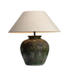 This rustic green-hued lamp base is designed in the Netherlands and made by hand in Portugal. By baking the vases with glaze at a very high temperature, an openwork, green, textured look is created. The jugs are then transformed into lamps in the workshop in the Netherlands. The shade is in natural linen.